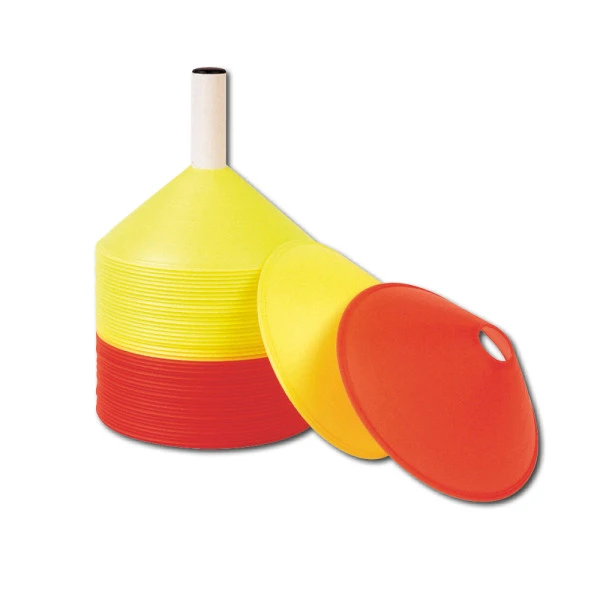 leichte Ausführung. Mit 48 Markierungshütchen. Aus elastischem Kunststoff im praktischen, platzsparenden Ständer, 24 orangefarbene und 24 gelbe Hütchen.