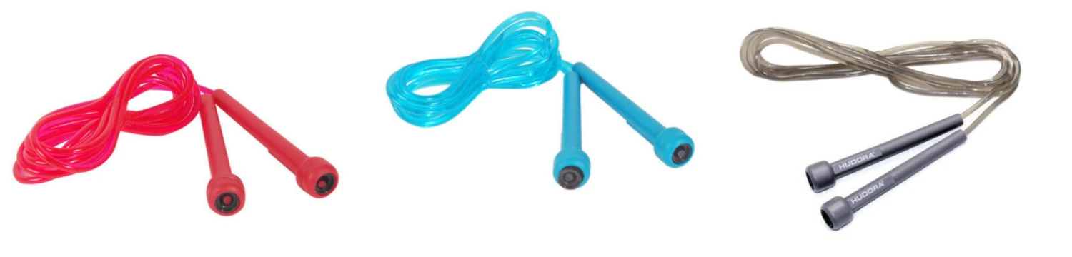 Hudora Fitnessspringseil in wiederverschließbarer Hülse verpackt mit High-Impact-Griffe. Die Springseile bestehen aus Kunststoff und sind in verschiedenen Farben und Längen lieferbar. Folgende Längen sind für folgende Körpergrößen passend: