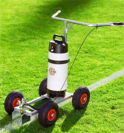 Stabiler Stahlrohrrahmen mit wetterfester Lackierung. 12 Ltr. Kunststoff-Farbbehälter, mit Handpumpe und Sicherheitsventil (TÜV geprüft);. Sprührichtung nach hinten angeordnet. Linienbreite verstellbar 50/120 mm. 3 große Laufräder aus Kunststoff.