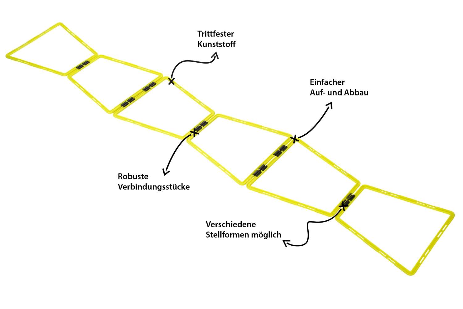 Unser innovatives Koordinations-Trapez in Signalfarbe lässt sich in nur wenigen Handgriffen schnell auf- und abbauen. Das robuste und flexible Material verhindert die Verletzungsgefahr beim Auftreten. Es bietet sich ideal an für Lauf-, Sprint- und Sprungtraining, Outdoor und Indoor. Das Koordination-Trapez ist die optimale Trainingshilfe für Fußball und viele weitere laufintensive Sportarten z.B. Handball, Basketball und Tennis.